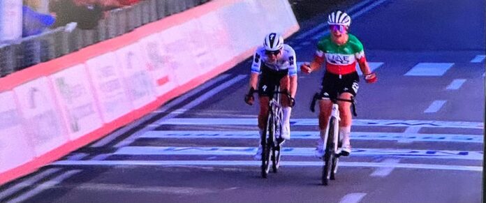Demi Vollering ha attaccato la Vallieres sul Montello, ma la campionessa del mondo ha mantenuto il proprio ritmo mantenendo il vantaggio della corsa. Ripresa della Longo Borghini e della Niamh Fischer-Black per una corsa a quattro a 13 km dal traguardo. Ashley Moolman è scivolata a 5km dall’arrivo, mentre sulla sulla salita dei Ronchi si riforma il gruppone con le inseguitrici, con l’attacco di Demi Vollering ed Elisa Longo Borghini con Niamh Fischer-Black alle spalle. La corsa a 3 km dalla fine è una questione a due tra la Vollering e la Longo Borghini, un bellissimo duello testa a testa con Elisa Longo Borghini attaccata all’olandese. Ruota a ruota fino alla fine, la Vollering ha provato a staccarsi a 1.3km dalla fine, la Longo Borghini non ha mollato ed ha attaccato a 200 metri dal traguardo, bruciando la Vollering sul traguardo al termine di una volata veramente entusiasmante.